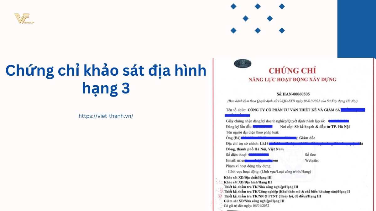 Chứng chỉ khảo sát địa hình hạng 3 là một trong những chứng chỉ quan trọng đối với những ai hoạt động trong lĩnh vực trắc địa và khảo sát địa hình. Công cụ không thể thiếu trong các dự án đo đạc hiện đại là máy GNSS RTK, máy thuỷ bình giúp đo đạc chính xác và hiệu quả. Vậy chứng chỉ khảo sát địa hình hạng 3 là gì? Làm sao để đạt được nó và những lợi ích cụ thể mà chứng chỉ này mang lại trong sự nghiệp? Hãy cùng Việt Thanh Group tìm hiểu qua bài viết dưới đây.