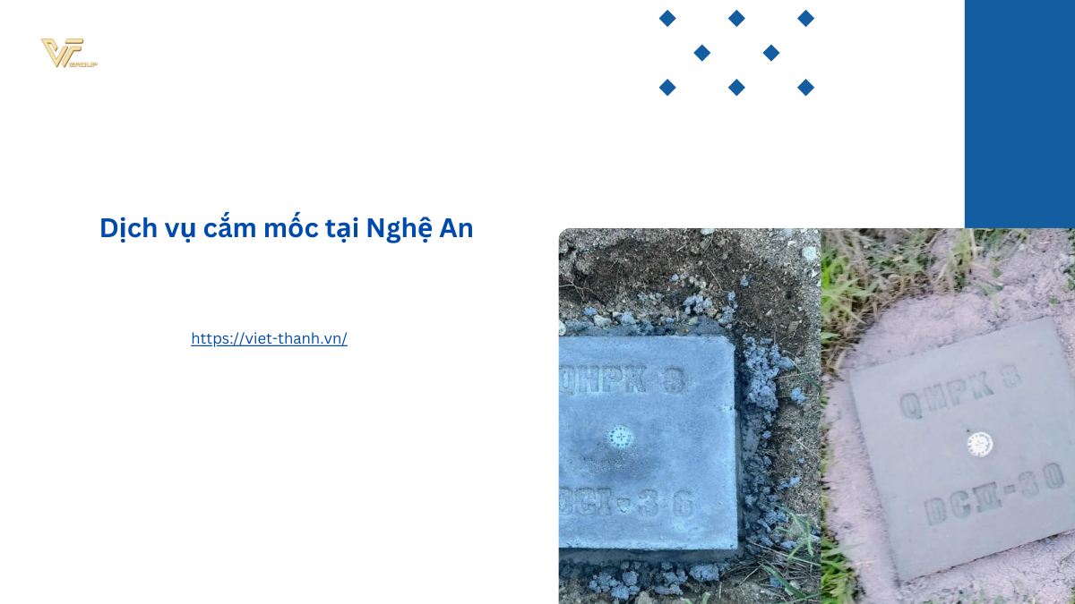 Bạn đang tìm kiếm dịch vụ cắm mốc tại Nghệ An uy tín, chính xác và đảm bảo đúng quy định pháp luật? Việt Thanh Group tự hào là đơn vị chuyên cung cấp các dịch vụ đo đạc và cắm mốc ranh giới đất đai hàng đầu tại Nghệ An với nhiều năm kinh nghiệm và đội ngũ kỹ sư địa chính chuyên nghiệp.Việc cắm mốc đúng kỹ thuật giúp xác định ranh giới đất rõ ràng, tránh tranh chấp và phục vụ tốt cho việc quản lý và công cụ hỗ trợ cho công trình như máy GNSS RTK. Việt Thanh Group sẽ cùng bạn tìm hiểu về dịch vụ cắm mốc tại Nghệ An.