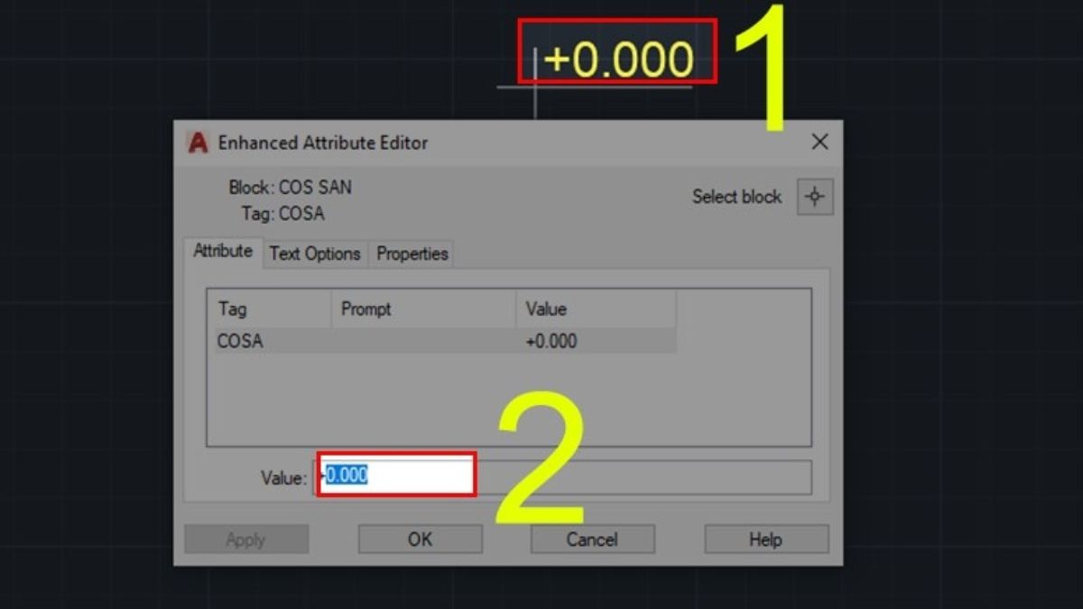 - Bước 2: Đúp chuột vào Text cao độ phía trên và chọn ký tự 0.000.