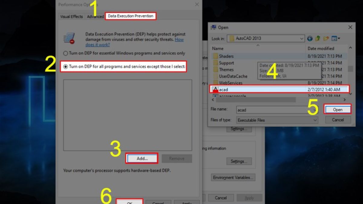 - Bước 4: Chọn tab Data Execution Prevention, tích vào Turn on DEP for all programs and services except those I select. Nhấn Add và chọn thư mục cài đặt AutoCAD. Bấm OK để hoàn tất.