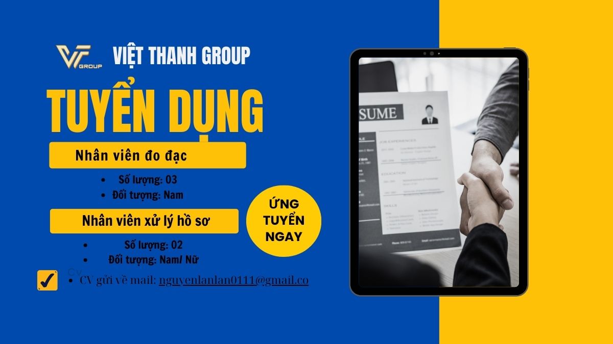 [Thanh Hoá] Công ty Cổ phần Tập đoàn Việt Thanh tuyển dụng nhân trắc đạc, nhân viên xử lý hồ sơ làm việc tại Thanh Hoá.