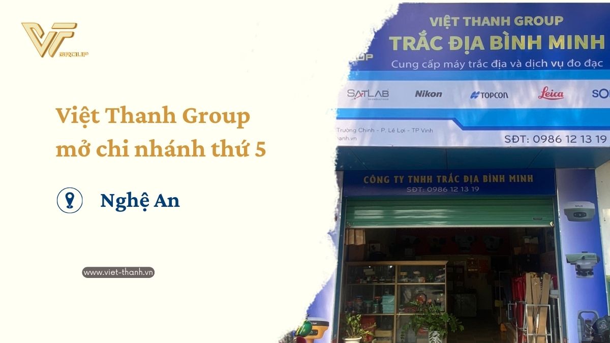 Với mục tiêu mang sản phẩm và dịch vụ đo đạc chất lượng đến gần hơn với khách hàng cả nước, trong tháng 04 năm 2024, Việt Thanh Group tiếp tục mở rộng thêm chi nhánh thứ 5 tại địa chỉ Số 116 đường Trường Chinh, Phường Lê Lợi, Thành phố Vinh, Tỉnh Nghệ An với tên đại diện tại chi nhánh là Trắc địa Bình Minh.